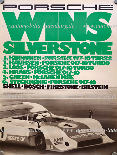 1973, original Rennplakat „Porsche wins Silverstone“, Entwurf Atelier Strenger, Mai 1973, 101x76cm, minimale Einrisse am unterem linken Rand, ansonsten guter Zustand