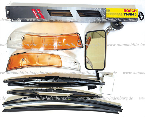 Konvolut darunter Rückspiegel / Außenspiegel (911.731.013.00); dazu 2 Bosch Blinkleuchten (43301R6), Bosch 450 Scheibenwischer