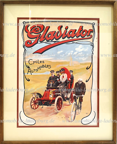 ca. 1908, original Werbeplakat "Gladiator Cycles - Automobiles", Entwurf Charles Tichon "Imp. Kossuth, Paris", im Passepartout, gerahmt 69,5x55,5cm, Rariät