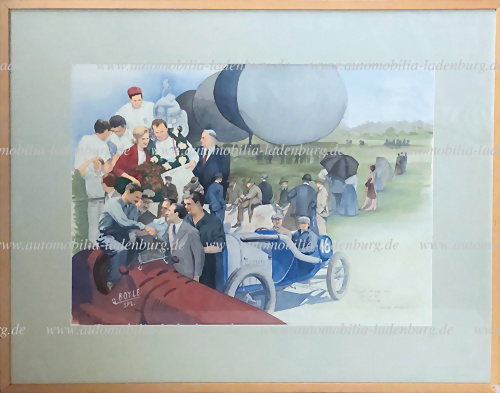 Original Gouache/Aquarell, Darstellung verschiedener Momente der Indy Geschichte u.a. Maserati Tipo 8TCF Monoposto 1938; A.J.Foyt; Jules Goux auf Peugeot 1916..., Entwurf M.L.Powell, signiert und beschriftet "Original Artwork for Official 1989 Indy 500 Program", im Passepartout, gerahmt, 83x104cm