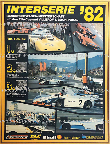 1982, Veranstaltungsplakat "Interserie 82 - Rennsportwagen Meisterschaft um den FIA-Cup und Villeroy & Bosch Pokal", gerahmt (ohne Glasscheibe), 99x70cm