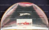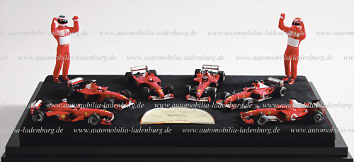 Diorama von Hot Wheels, Sonderedition, mit 6 Ferrari Formel 1-Rennwagen, die Gewinnerfahrzeuge der Jahre 1999 bis 2004, Maßstab 1:43, sowie den jubelnden Ruben Barichello und Michael Schumacher, in Acrylglas-Sichtkasten, auf schwarzem Wildleder, 42x25x18cm; neuwertig