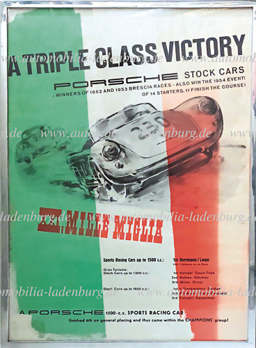 1954, original Rennplakat „A Triple Class Victory – Porsche Stock Cars – Winner of 1952 and 1953 Brescia Races – Also win the 1954 Event!“, Entwurf Werbeagentur Strenger, gerahmt 59x44cm
