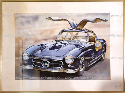 Original Aquarell im Passepartout, Motiv Mercedes-Benz Typ 300SL, signiert vom Künstler "M.J.85?", gerahmt 71,5x91,5cm