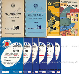 Konvolut 6 Reglements Liege – Sofia – Liege, 1961 (mit Zeitwertungsheft Wagen 20 unvollständig, sowie alter Landkarte ehem. Jugoslawien), 2x 1962, 2x 1963, sowie 1964 (mit Zeitwertungsheft Wagen 149 „Specimen“ ungenutzt), guter Zustand