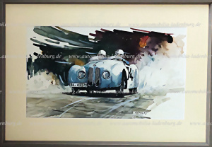 Aquarell, Fritz Huschke von Hanstein / Walter Bäumer auf BMW 328 Touring, Sieger der Mille Miglia 1940, signiert "Weinert", hochwertig gerahmt, 69x77cm
