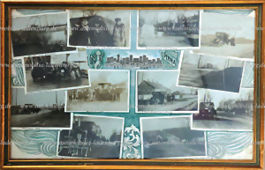 Collage mit insgesamt 12 original s/w Aufnahmen "The Daytona Run 1906", Oldsmobile "Mudlark", Ralph Owen und seiner drei Passagiere Roland Corneille, F.W.Work und Andrew Auble Jr., New York - Daytona. Die Fahrt begann am 23.Dezember.1906 von New York nach Harrisbourg Pennsylvania (dies war ein Umweg nach Florida, jedoch gab es damals nicht viele beleuchten Straßen für Autofahrer). Der Artikel über die Fahrt wurde 1907 in der März-Ausgabe der Detroiter Zeitschrift "Motor-Talk" veröffentlicht, gerahmt, 48x70cm, schönes Zeitdokument