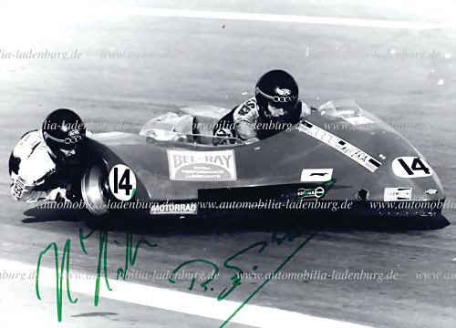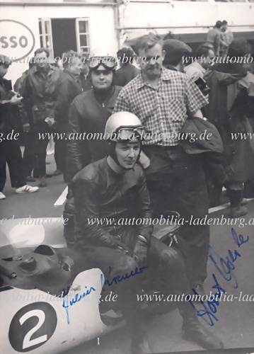 Handsignierte original s/w Aufnahme signiert von Mike Hailwood und Geoff Duke, 14x9cm