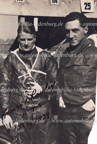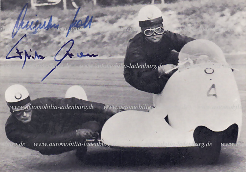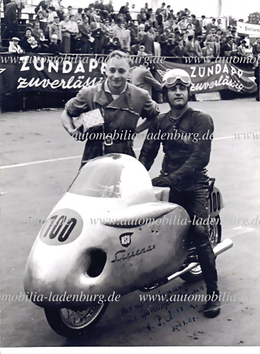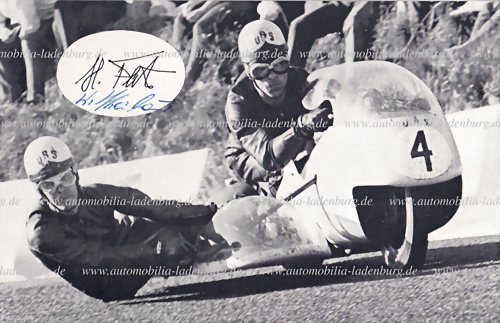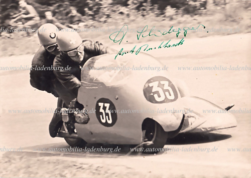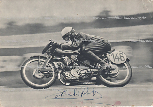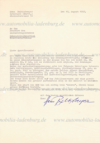 Handsigniertes Schreiben von Hans Baltisberger an das Rennbüro des Sachsenrings, betreffend, betreffend Erhalt des Nennungsformular für das Rennen, sowie Änderung der Startnummer in der Klasse 500ccm..., datiert 19.08.1952, dazu original s/w Aufnahme Hans Baltisberger, 20x13cm