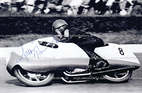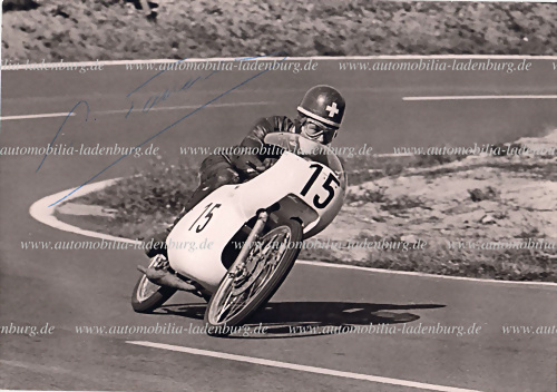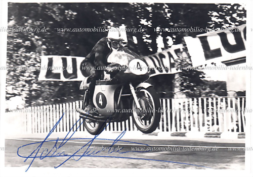 Handsignierte s/w Aufnahme / Autogrammkarte, signiert von Luigi Taveri auf Kreidler Florett, 10x15cm