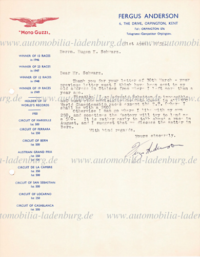 Handsigniertes Schreiben von Fergus Anderson an Eugen K. Schwarz, betreffend Absage zur Teilnahme an Rund um Schotten 1951, datiert 21.April.1951