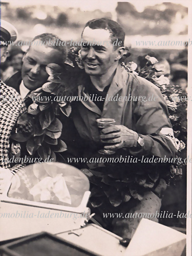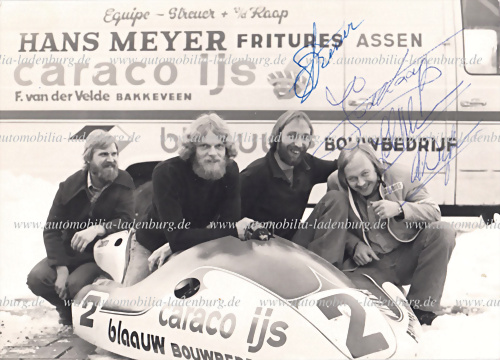 Handsignierte original s/w Aufnahme, signiert von Egbert Streuer, John Van der Kaap, sowie von den Mechaniker Andries Dykstra und Hans Klaassens, 12x17cm, gestempelt "Erich Kirsch"