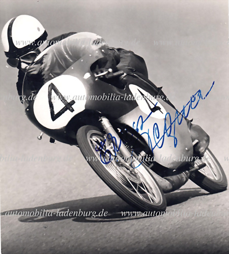 Handsignierte s/w Aufnahme, John Surtees auf MV Augusta, 9x13,5