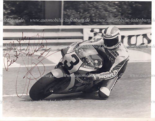 Handsignierte original s/w Aufnahme Freddie Spencer auf Honda, 19x24cm