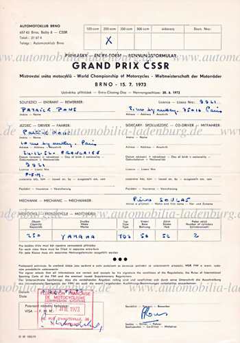 Handsigniertes Nennungsformular von Patrick Pons, Teilnahme am Grand Prix CSSR Brno 1973, Pons auf Yamaha 250ccm, inkl. s/w Autogrammkarte 10x15cm,