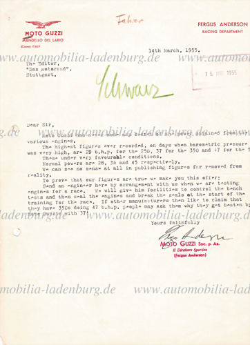 Handsigniertes Schreiben von Fergus Anderson an den Verlag der Zeitschrift "Das Motorrad", hier beschreibt Anderson das Moto Guzzi keine Geheimnisse über die Leistungen der Motoren hat, er bietet dem Verlag an einen Mechaniker zu senden der bei Tests für Rennen die Motoren prüfen kann, datiert... mehr
