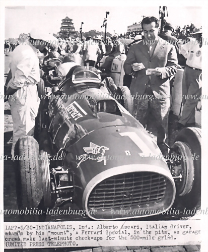 Original s/w Aufnahme Alberto Ascari neben seinem Ferrari 375 Indy, Indianapolis 1952, 22x18cm, gestempelt "Telephoto United Press Association"