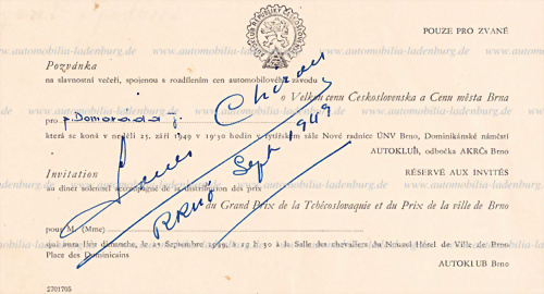 Handsignierter Beleg signiert von Louis Chiron "Brno Sept. 1949", 10,4x20cm