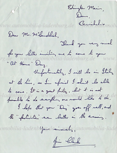 Handgeschriebener und signierter Brief / Dankschreiben von Jim Clark, 17x13cm