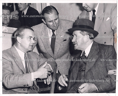 Original s/w Aufnahme Rudolf Caracciola im Gespräch mit Ferdinand Porsche, 18x22cm, gestempelt "Associated Press Bilderdienst"