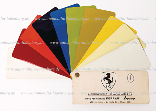 Lackmusterkarte Carrozzeria Scaglietti für Ferrari Dino, mit insgesamt 9 Lackmusterfarben u.a. Giallo Dino, Bianco Polo Park, Giallo Senape..