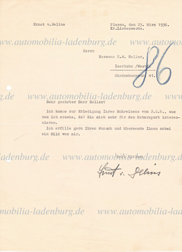 Handsignierter Brief Ernst von Delius, datiert 23.März.1936