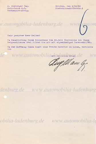 Handsignierter Brief von August Momberger, datiert 03.10.1934