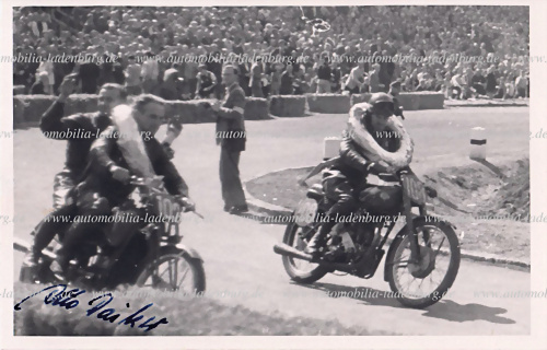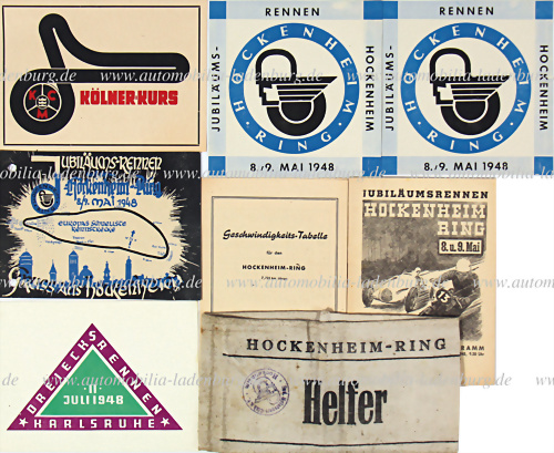 Konvolut 8tlg., darunter Programmheft 1948, Postkarte 1948, Armbinde Helfer, 2x Durchfahrtsschein 1948 und Geschwindigkeits Tabelle 1948, dazu zwei Wasseraufkleber Kölner Kurs und Karlsruher Dreiecksrennen 1948, guter Zustand