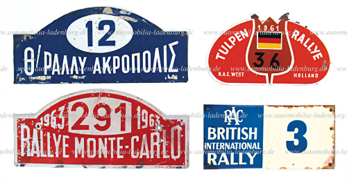 Konvolut 4 Startnummernschilder darunter Rallye Akropolis 1958, Startnummer 12, H.J. Walter; RAC Int GB Rally 1961, Start-Nr. 3 Walter, Ergebnis Platz 15, EM-Jahr; Rallye Monte Carlo 1963, Start-Nr. 291, Walter/Ewald Stock, 37. Platz, Porsche 356 1600 Carrera, sowie Tulpen Rallye 1961, Start-Nr. 36,... mehr