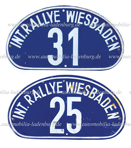 Konvolut 2 Startnummernschilder Internationale Rallye Wiesbaden Start-Nr.25 und 31Teilnahmen H.J. Walter in 1958 mit R.Rinn, Porsche 365, 1 Platz 1958, sowie 1963, H. J. Walter/Otto Castell, auf Porsche 356 1600 Carrera, Platz 4