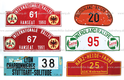 Konvolut 6 Startnummernschilder darunter Deutschland Rallye 1960, Start-Nr.20; 2x Rallye Hanseat 1961, Start-Nr. 61+67; Int. Roland Rallye Start-Nr. 95;Lyon-Carbonnières Stuttgart-Solitude 1962, Startnummer 38, sowie ADAC Harz-Heide-Fahrt Start-Nr. 25
