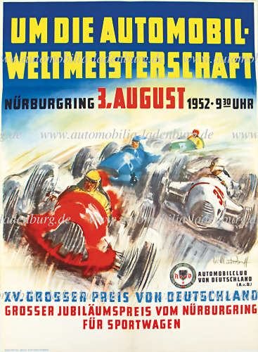 952, original Veranstaltungsplakat „Um die Automobil-Weltmeisterschaft XV. Großer Preis von Deutschland 03.August.1952“, gefaltet, 67,5x48cm, guter Zustand