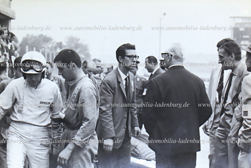 60er Jahre, original s/w Aufnahme (Goddard), John Surtees, Mauro Forghieri und Enzo Ferrari bei Trainingsfahrten in Monza, 11x16cm