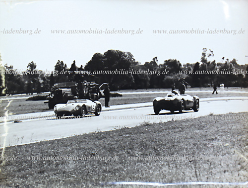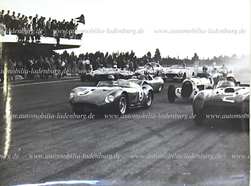 original s/w Aufnahme, Startszene Rafaela 500 1959, Bonomi auf Maserati 300S neben Gonzalez auf Ferrari 375 Plus (Chevrolet), 18x24cm