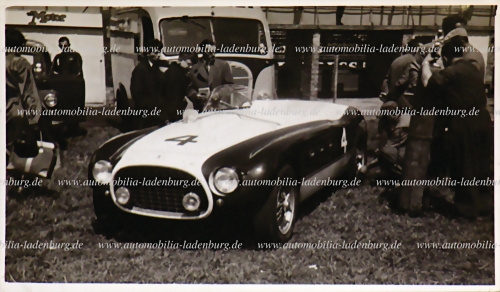 original s/w Aufnahme, der Ferrrai 340 MM Vignale Spyder (#0324AM) von William Spear, Silverstone 1953, 8x14cm