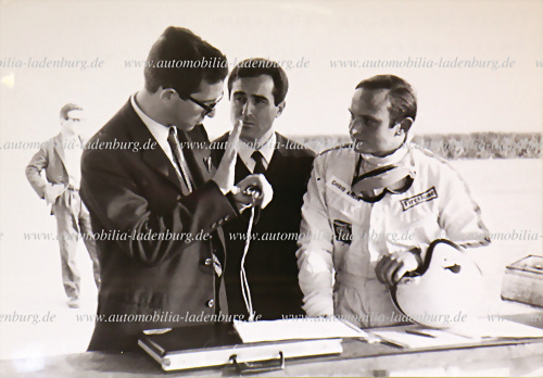 original s/w Aufnahme, Lorenzo Bandini und Chris Amon im Gespräch mit Mauro Forghieri, wohl bei Testfahrten in Modena, 13x18cm
