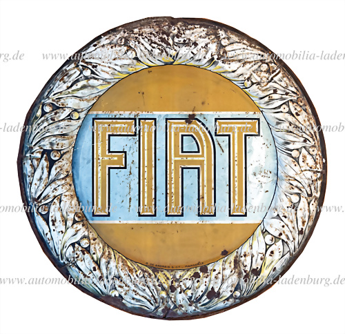 20er Jahre, seltenes doppelseitiges lithographiertes Fiat Händlerschild, unten mit Herstellervermerk G. de Andreis & C., Marseille, seltene orange/hellblaue Version, Durchmesser 92cm, schöne Patina, original belassen, vereinzelt am Rand mit leichtem Substanzverlust, Rarität