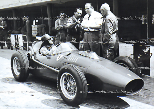 Monza 1958, original s/w Aufnahme Saveri und Martino bei Testfahrten auf Ferrari Dino 246 F1, neben dem Wagen ist Carlo Chiti zu sehen, die Fahrten wurden für das 500 Meilen Rennen in Monza durchgeführt, 13x18cm