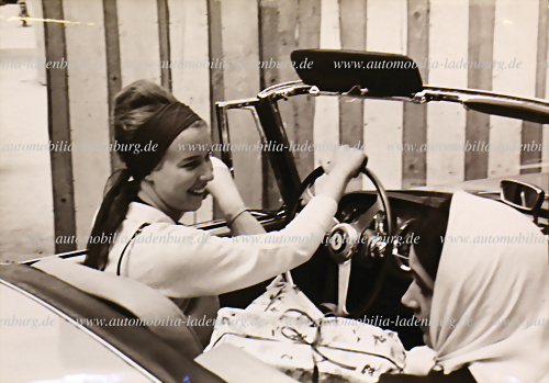 original s/w Aufnahme, Prinzessin Marie-Gabrielle de Savoy am Steuer des Ferrari 250 GT Cabriolet (#1753GT), 18x24cm