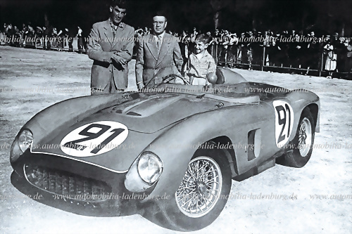 Original s/w Aufnahme Fernand Tavano posiert mit seinem Sohn vor dem Ferrari 500 TR Spyder Scaglietti (#0624MDTR), 1956 Le Mans, wunderschöne Aufnahme, gestempelt „LaFay“, 13x18cm