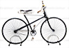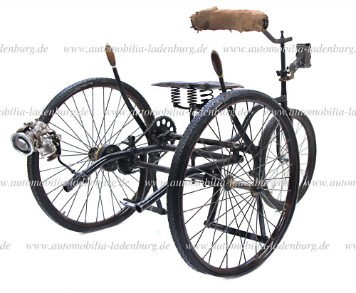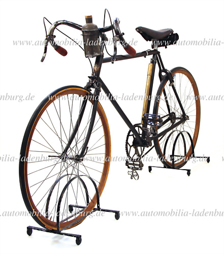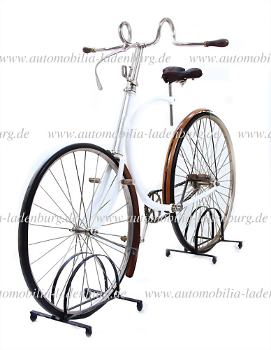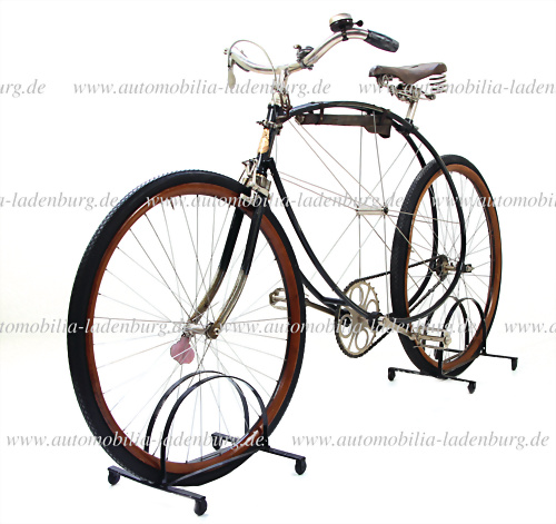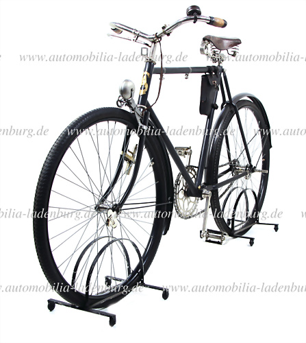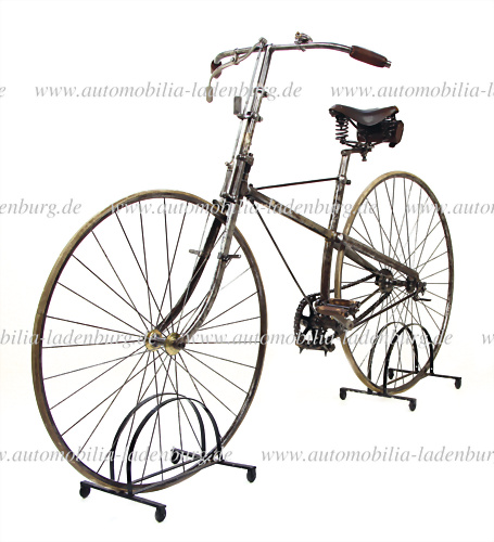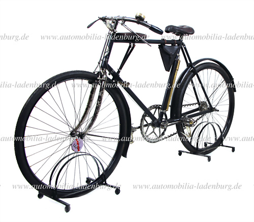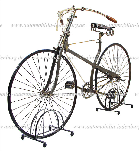 1890, Kreuzrahmenrad mit Stahlrohrrahmen, Blockkette, Löffelbremse, breite Radialspeichenräder mit Vollgummireifen, verstellbarem Kettenspanner am Tretlager, Sattel nicht original, Vorderrad 72 cm (28 Zoll), Hinterrad 72 cm (28 Zoll)