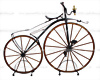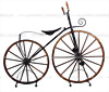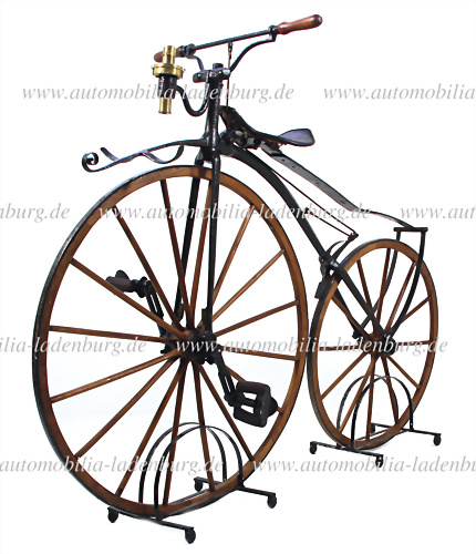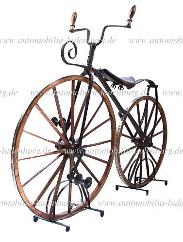 1868, Boneshaker mit Holzspeichenrädern mit Eisenbereifung, original Sattel auf Blattfedern, nach oben gebogene Lenkstange mit Holzgriffen, schmiedeeiserner Rahmen, eichelbeschwerten Pedalen, Vorderrad 90 cm, Hinterrad 75 cm, Länge 170 cm, Lenkerhöhe 140 cm
