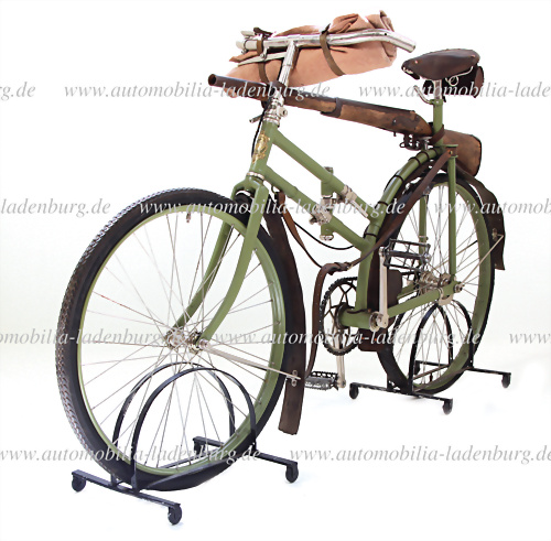 1914, tragbares Militär Klapprad, Systems „Capitaine Gerard“, entwickelt von Carles Morel und als Bicyclette „Pliante“ bekannt, mit Rahmen-Nr. 45383, eines der frühen Exemplare dieser für den Feldeinsatz konzipierten Militärfahrräder. Ausgestattet mit Lederkotflügeln, Bremse im Lenkerschaft,... mehr