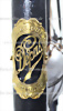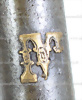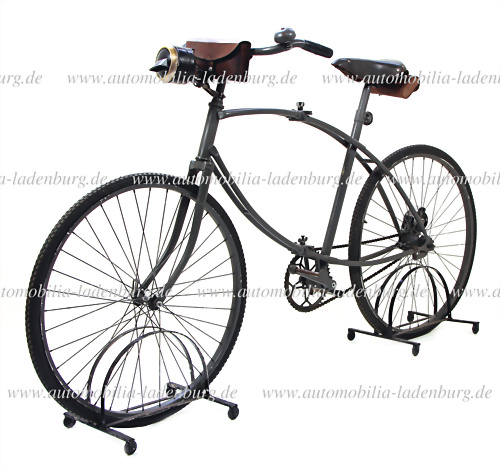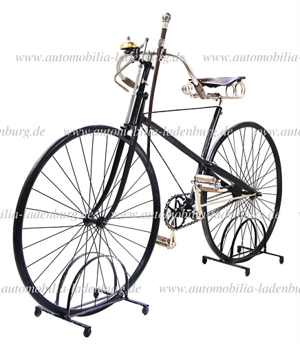 1885, Kreuzrover mit Nackensteuerung, Löffelbremse, Stahlrahmen, Kettenstarrlauf, Stahlfelgen, Radialspeichen, Vollgummireifen, Peitschenhalter mit Peitsche, original Sattel, Buchstabe M auf Rahmenrohr, Vorderrad 75 cm (30 Zoll), Hinterrad 75 cm (30 Zoll)