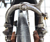 1886, Kangaroo-Sicherheitsrad „Safety“ mit doppeltem Kettenantrieb aufs Vorderrad, Stahlrohrrahmen, Vorderradstahlfelgen mit Tangentialspeichen und Vollgummireifen, Löffelbremse und Nackensteuerung, original Sattel, Peitschenhalter mit Peitsche, Hinterradachse gestempelt Patent D. Rudge’s 2512 und... mehr