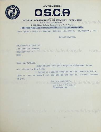 1957, handsignierter Brief von Rennfahrer Edgar Fronteras, datiert 28.Februar.1957