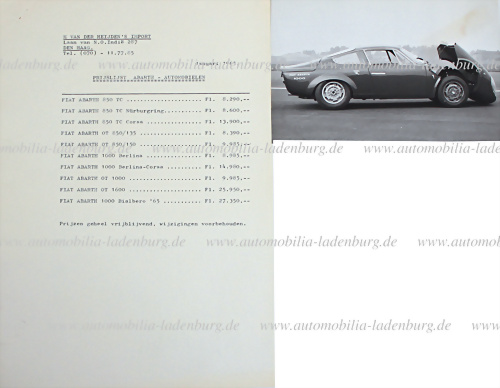 1965, Preisliste „H.van Heijden´s Import Den Haag“, für Modelle 850TC / 850TC Nürburgring / 850 TC Corsa / OT 850/135 / OT 850/150 / 1000 Berlina / 1000 Berlina Corsa / OT 1000 / OT 1600 / 1000 Bialbero 1965, dazu original s/w Pressefoto Abarth 1000 Bialbero, 11,5x18cm