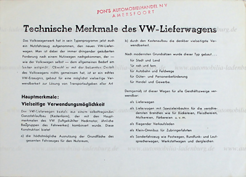 1948, Faltprospekt „Technische Merkmale des VW Lieferwagens“, 4 Seiten deutscher Text, selten
