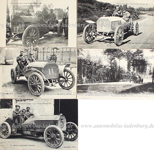 1905, Konvolut 5 Postkarten Gordon Bennett Rennen 1905, u.a. Werner auf Mercedes, 2x Braun auf Mercedes, Burton auf Mercedes, Hyeronimus auf Mercedes, je 9x14cm