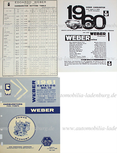 1961, Verkaufskatalog Weber Vergaser und Benzinpumpen, für u.a. Abarth, Fiat, Alfa Romeo, Ferrari, Porsche, Lancia, Aston Martin...; dazu Einstelltabelle u.a. Ferrari 250GT, Aston Martin DB4 GT; Alfa Romeo Giulietta Sprint; Abarth 750..., dazu Werbeanzeige 1960 Weber Carburetor